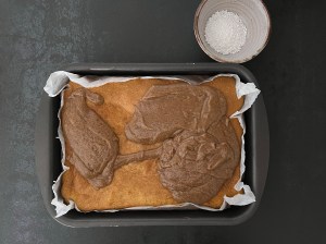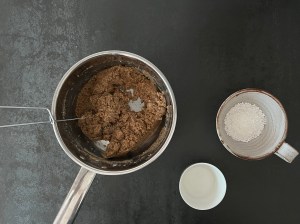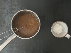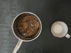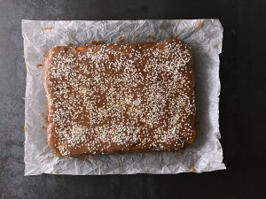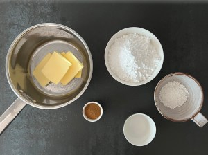 När kakan står i ugnen förbereder jag glasyren. Jag blandar kanel och florsocker, väger upp vatten och smälter smöret. Vispar ned sockerblandningen i det smälta smöret och vispar klumpfritt. Tillsätter sedan vattnet och vispar slätt. Skulle glasyren stelna lite för mycket innan den hälls över kakan så värm försiktigt och rör med en slickepott.