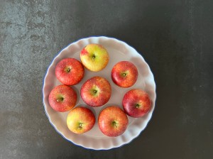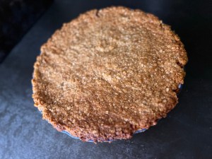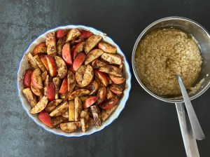 Smeten fördelar jag över äpplena och sedan bakar jag av pajen. Låter den svalna innan jag serverar den så att toppingen blir riktigt knäckig.