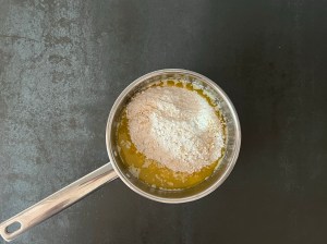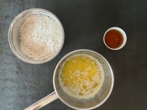 Sen blandar jag degen. Först väger jag upp alla torra ingredienser i en skål. Smälter smöret och tillsätter sirap i smöret. Blandar sedan ner mjölblandningen i sirapssmöret och blandar till en tjock smet.