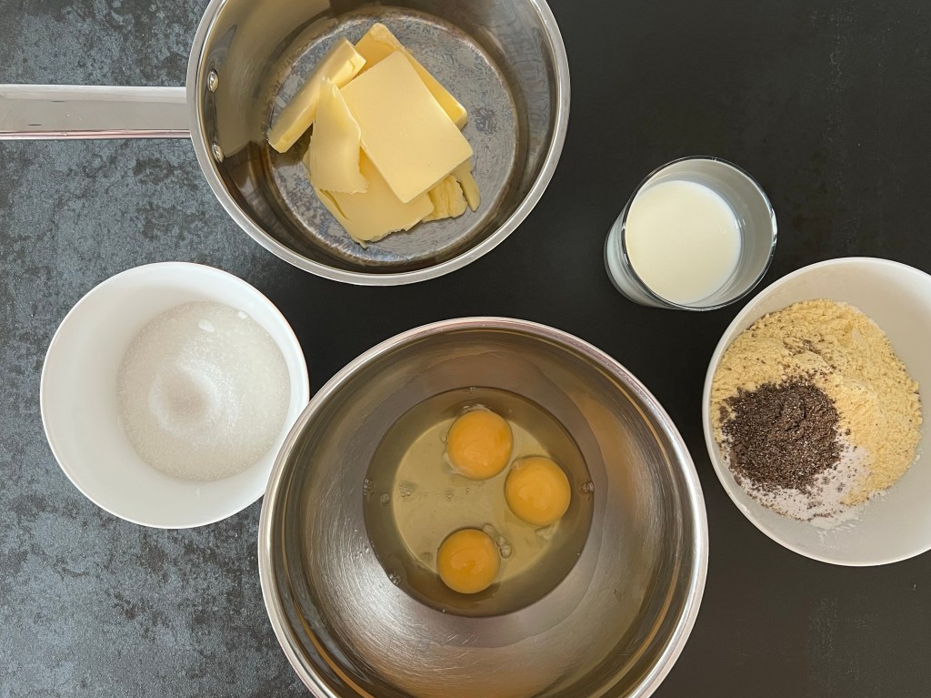 Jag börjar med botten. Mortlar kardemumman, blandar en mjölmix av alla torra ingredienser förutom socker. Smälter smör och tillsätter mjölken. Sen vispar jag ägg och strösocker vitt och pösigt.