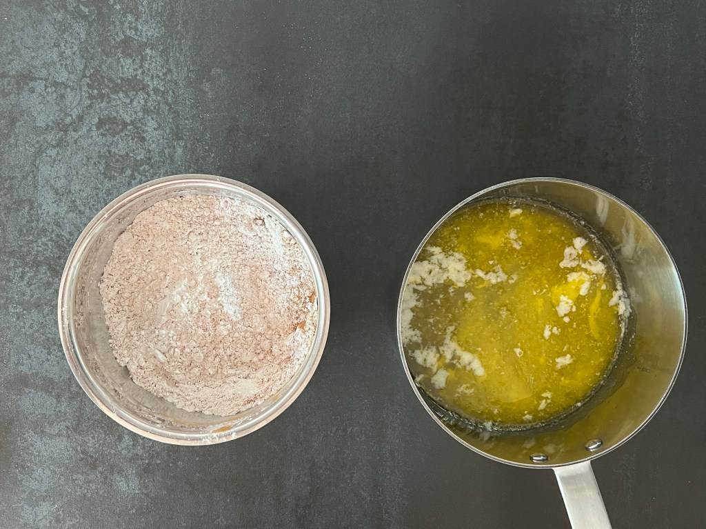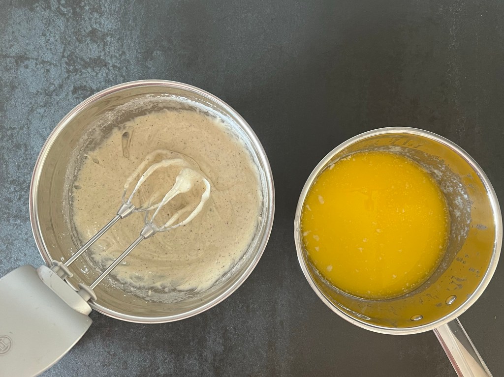 Jag siktar sedan i de torra ingredienserna i smältvattnet och vispar det sedan slätt.
