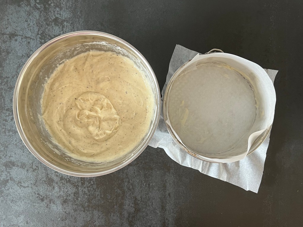 Efter det tillsätter jag mjölmixen och och vispar slätt på låg hastighet och därefter tillsätter jag smörmjölken och vispar slätt på låg hastighet. Smeten häller jag seden i en springform som jag klätt både botten och ram med bakplåtspapper.
