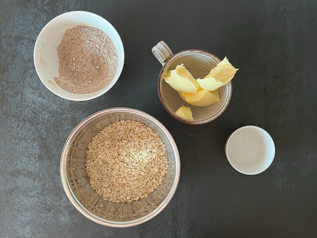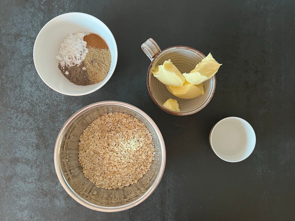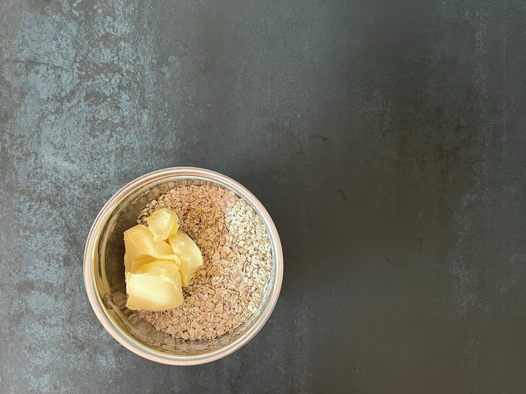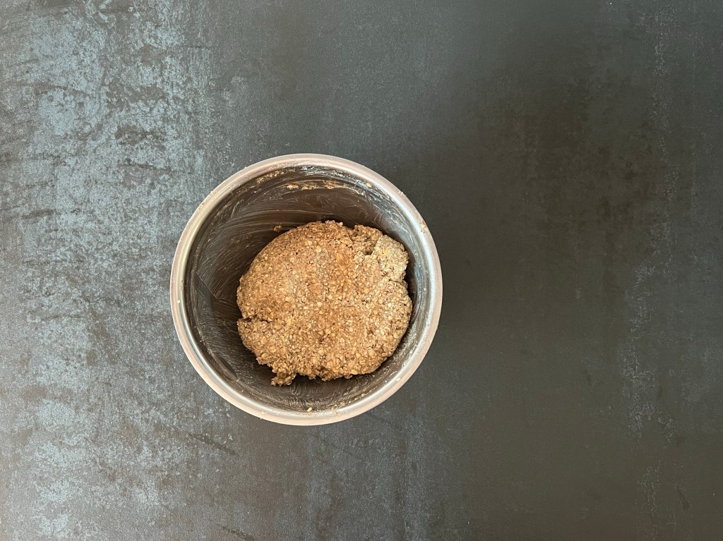 När botten svalnar så gör jag kanelbullebollssmeten och formar två plattor. Först mixar jag havregrynen i en matberedare, sen mäter jag upp resten av alla ingredienser. Blandar de torra ingredienserna tillsammans i en bunke.