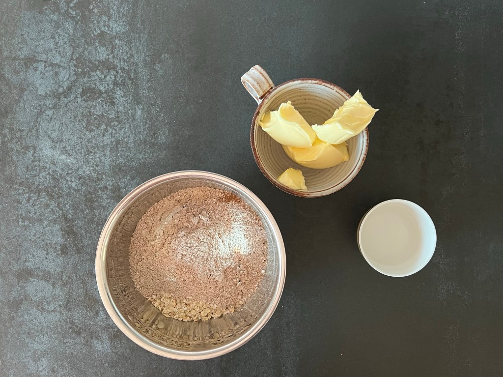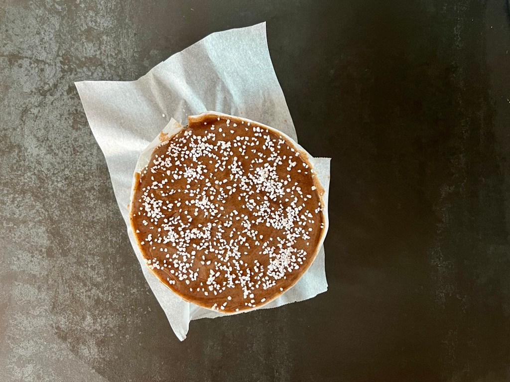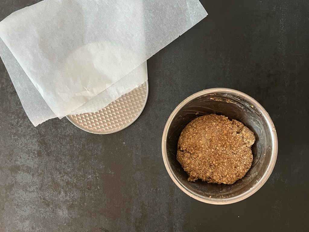 Jag tillsätter vattnet och smöret och blandar till en jämn deg med en gaffel. Jag delar upp degen i två lika stora bitar och plattar ut på ett bakplåtspapper, till lika stora plattor som springformens botten. Bottnarna lägger jag i frysen en liten stund så att de stelnar och är lättare att hantera.