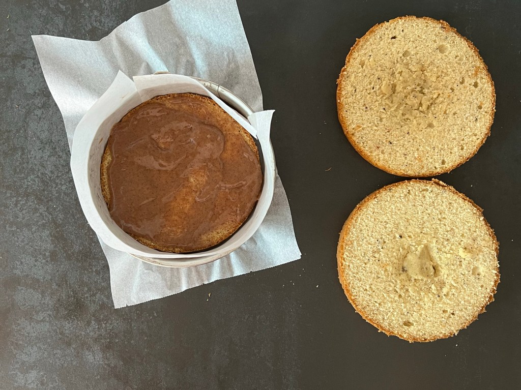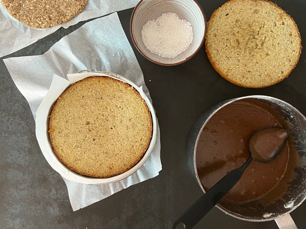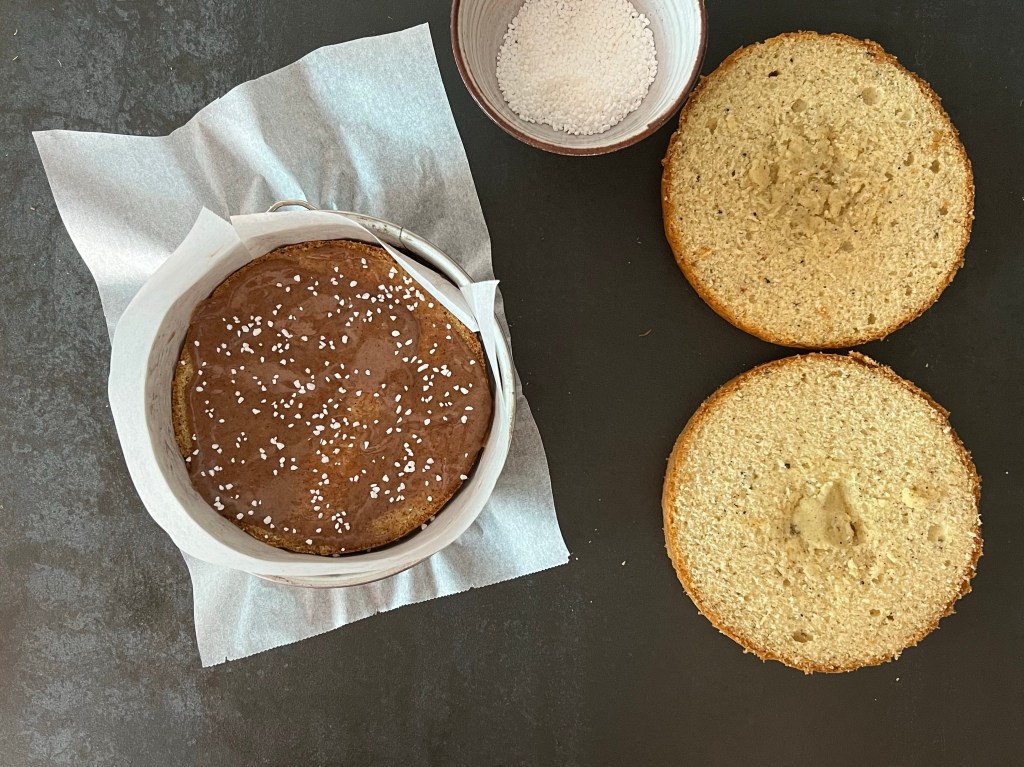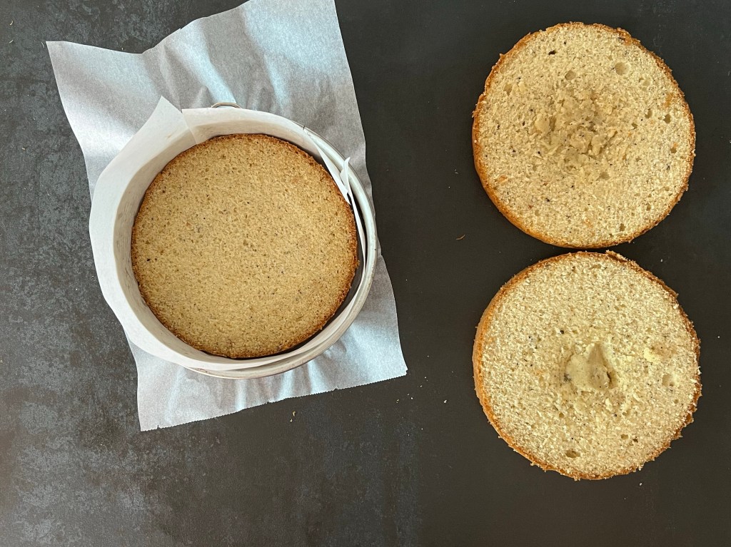Kakan bakar jag sedan av i ugnen och när den kommer ut lägger jag en bakplåtspappersklädd plåt ovanpå och vänder den uppochned, så att den får svalna så i formen. Då får man en jämn och platt yta på kakan, vilket underlättar monteringen.