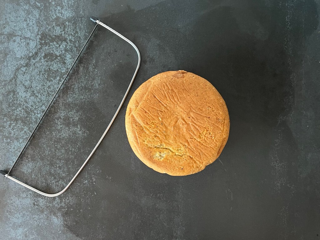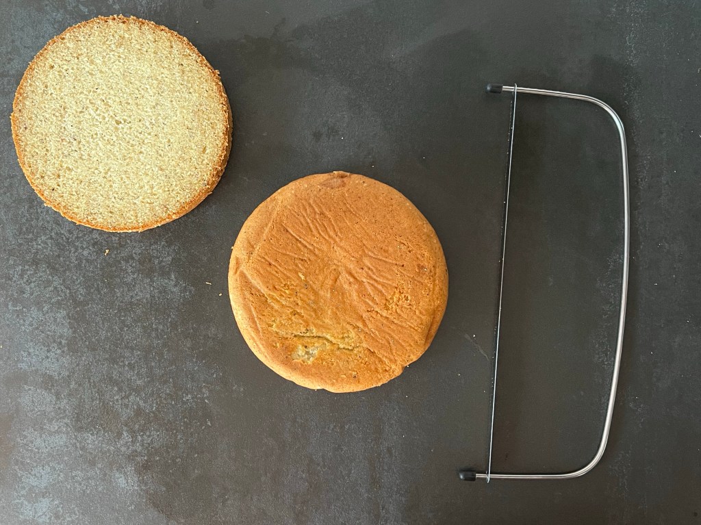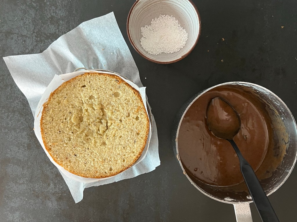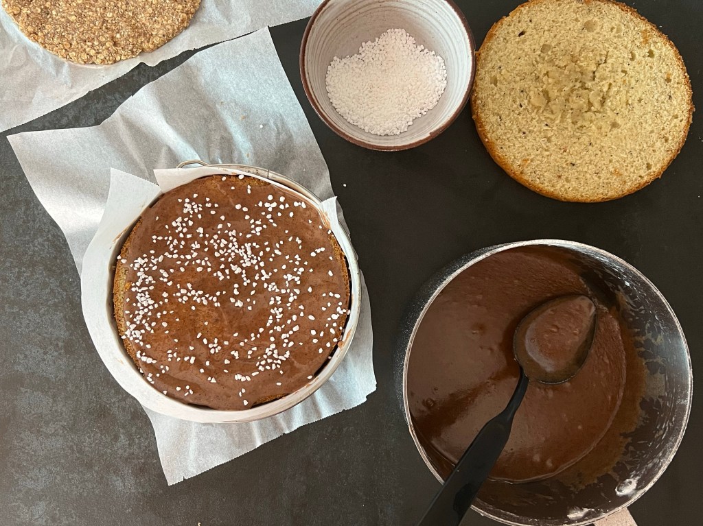 Kakan bakar jag sedan av i ugnen och när den kommer ut lägger jag en bakplåtspappersklädd plåt ovanpå och vänder den uppochned, så att den får svalna så i formen. Då får man en jämn och platt yta på kakan, vilket underlättar monteringen.