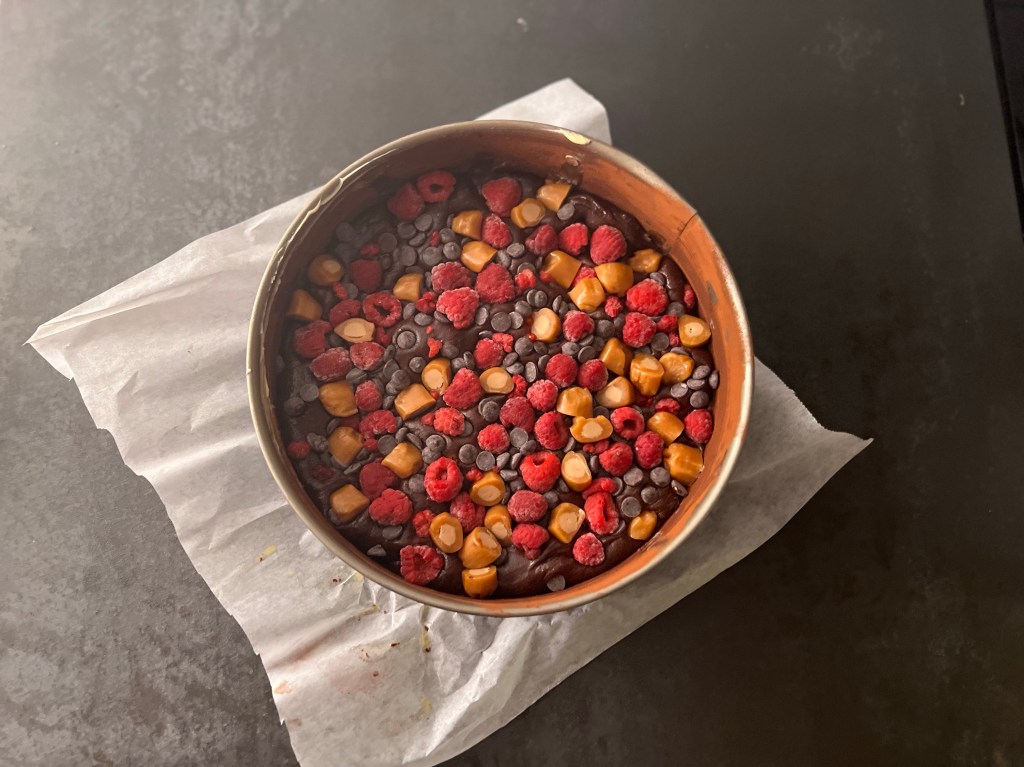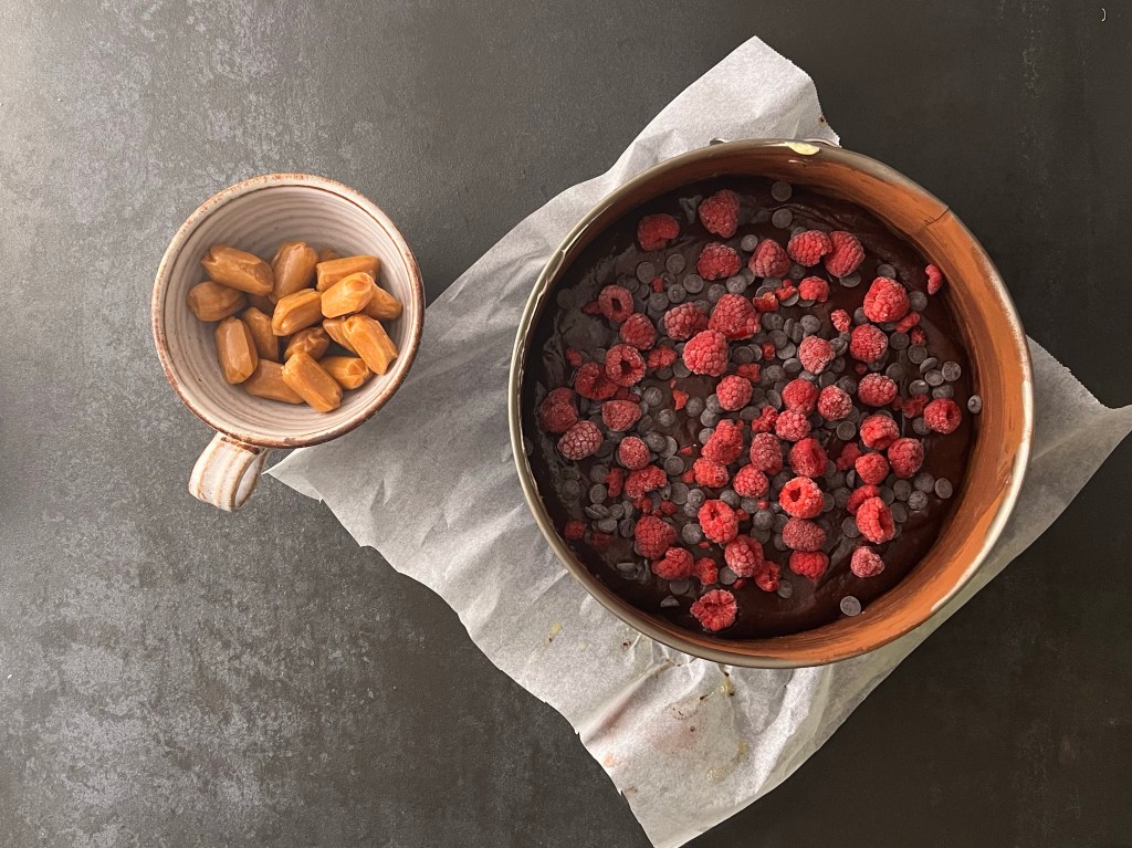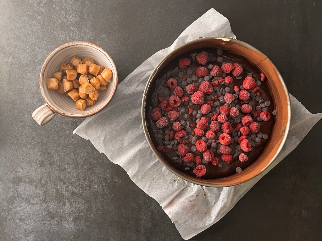 Jag delar kolan på mitten och toppar kakan med chokladen, hallonen och kolan. Sen pressar jag ned dem i smeten och bakar av den.