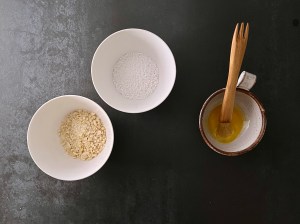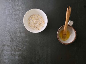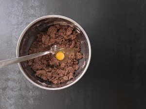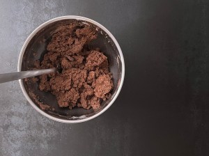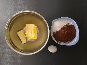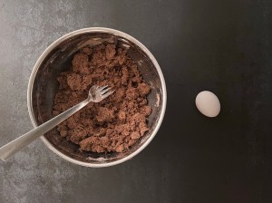 Först blandar jag alla torra ingredienser i en skål. Sen väger jag upp smöret i en bunke och tar fram ett ägg. Häller mjölmixen över smöret och arbetar samman till en grynig massa, med gaffel och för hand.