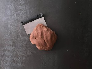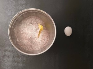 Efter det tillsätter jag ägget och arbetar samman degen till en jämn och smidig massa. Sist avslutar jag med att knåda den på bänken. Om den kladdar och fastnar lite så ta en degskrapa och skrapa samman den med.