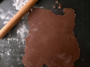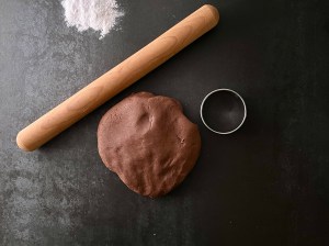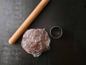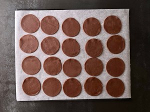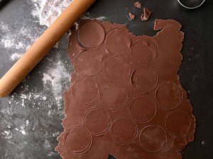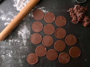 Jag kavlar halva degen i taget på lätt mjölad bänk, med mjölad kavel. Till en tunn platta, ca 1-2mm. Efter det stansar jag ut plattor, cirka 8cm i diameter ur plattan. Lägger plattorna på bakplåtspappersklädd plåt och knådar samman restbitarna och kavlar om dem. Upprepar tills all deg är kavlad och stansad.