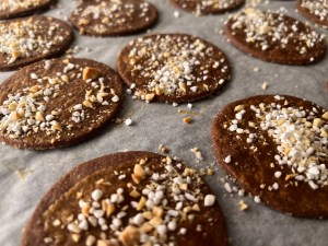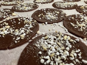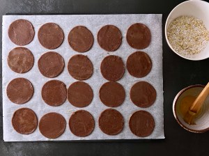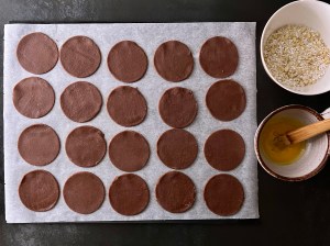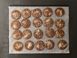 Penslar plattorna med äggula och stör hackad mandel och pärlsocker över innan jag bakar av dem. När de kommer ur ugnen får de svalna på pappret innan jag flyttar dem till en burk med tätt lock.