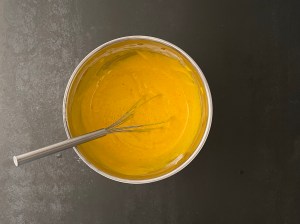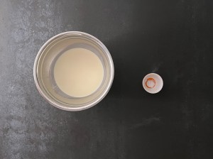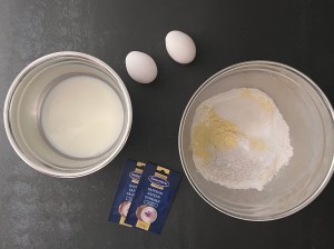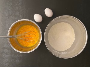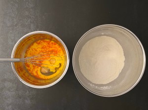 Jag börjar med att låta saffranen dra i mjölken, minst 10min, gärna längre tid. Sen väger jag upp alla torra ingredienser i en bunke och blandar dem. Knäcker sedan äggen i saffransmjölken.