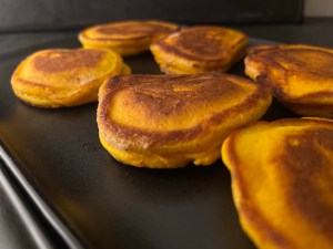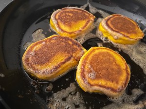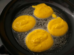 Värmer upp stekpannan med fett i, jag steker helst inte i olja då jag vill kunna se på fettet att det inte är för varmt (och bränner). Klickar med en matsked smeten i pannan och steker dem gyllenbruna på båda sidorna.
