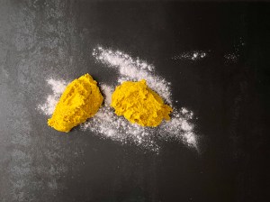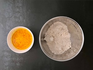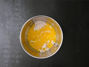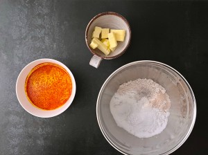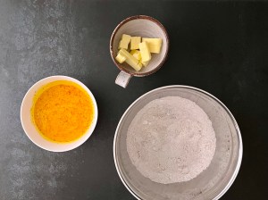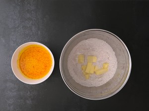 Jag börjar med att blanda saffran med mjölken, så att den får stå och dra lite, minst en kvart, gärna en timma om tid finnes. Sen blandar jag alla torra ingredienser i en skål och tärnar det kalla smöret.