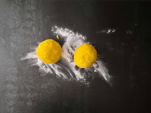 Efter det nyper jag samman smöret med mjölmixen till en fingryning massa, tillsätter saffransmjölken och arbetar till en jämn deg med en träslev. Väger upp degen i två lika stora bitar och lägger på lätt mjölad bänk.