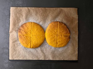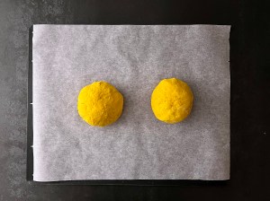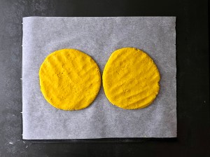 Jag rullar degbitarna till två jämna bollar, med lätt mjölade händer, lägger bollarna på bakplåtspappersklädd plåt och plattar ut till ca 15cm i diameter.