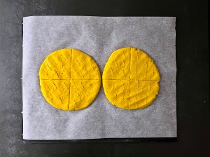 Jag skårar dem till 4 lika stora bitar per kaka och naggar dem med en gaffel för att sedan baka av dem. När de är färdiga får de svalna på ett galler innan servering.