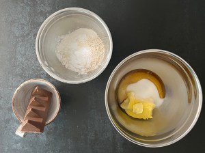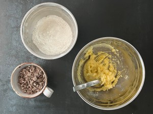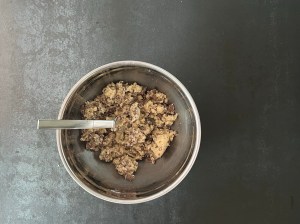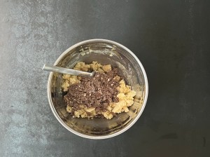 Tillsätter sedan mjölmixen och blandar till en jämn och grovklumpig deg. Tillsätter den hackade chokladen och blandar samman allt med gaffeln. Sista arbetar jag snabbt samman för hand och delar sedan degen i två jämnstora bitar.