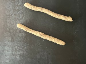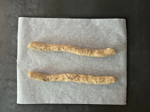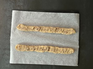 Jag rullar degbitarna till två jämntjocka korvar som jag lägger på en bakplåtspappersklädd plåt och trycker sedan till dem med en gaffeln innan jag bakar av dem.