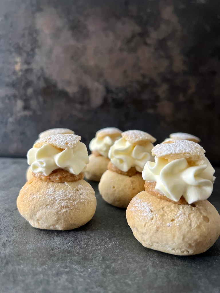 Vid montering klipper jag upp locket, spritsar mandelmassa i hålet, toppar med en klick grädde som jag spritsar med stjärntyll. Lägger på locket och pudrar med florsocker.