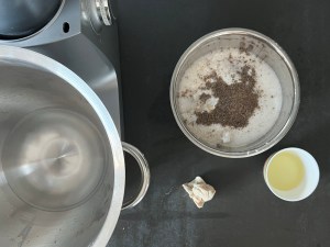 Jag börjar med att mixa kardemumman, sen blandar jag alla torra ingredienser i en skål. Väger upp jäst, olja och vatten. Löser upp jästen i vattnet, tillsätter oljan och hälften av mjölmixen, blandar samman i maskinen och tillsätter sedan resten av mjölmixen.