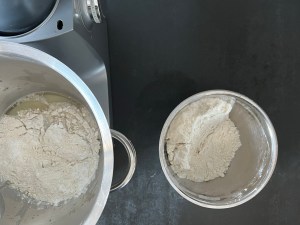 Stanna maskinen och tillsätt resten av mjölet, kör samman degen och när mjölet är inarbetat öka farten till lite över medel och kör i 4min