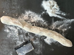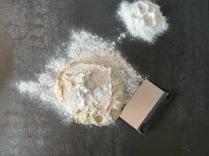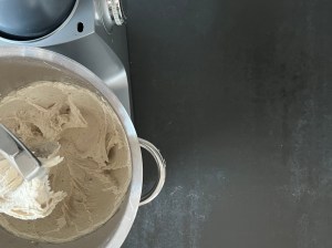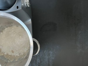 Blandar sedan degen i ca 4min med vingen. Skrapar samman, täcker bunken och låter den vila i 10min innan jag tar upp degen på mjölad bänk.