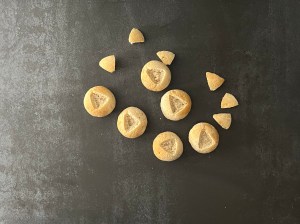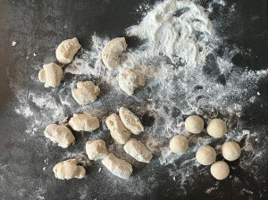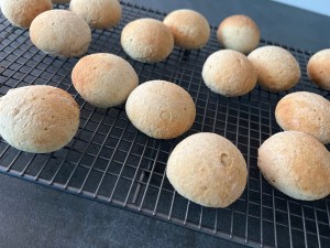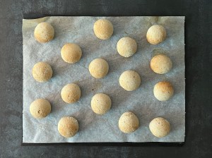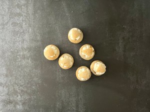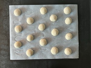 Jag mjölar degen och formar den till en lång korv, delar i ca 32st bitar á 25g styck. Rullar dem till jämna bollar och lägger på bakplåtspappersklädda plåtar, plastar lätt och låter jäsa i ca 45min.