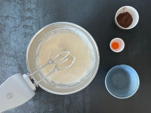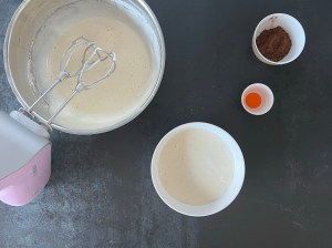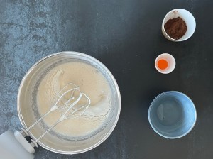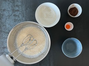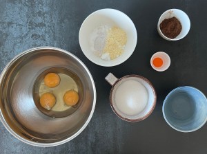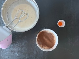 Jag börjar med rulltårtan. Väger upp socker och i en bunke, alla torra ingredienser förutom kakaon väger jag tillsamman i en skål och sen markerar jag vatten i vattenkokaren och sätter kakaon i en egen liten skål. Vispar sedan ägg och socker vitt och pösigt och blandar mjölmixen med en gaffel.