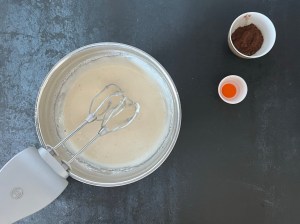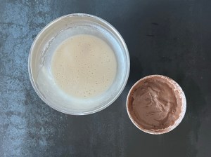 Efter det väger jag upp 150g av smeten i en egen skål, siktar med kakaon i smeten, vispar samman och tillsätter den lilla mängden hett vatten.