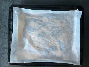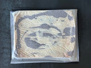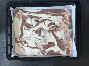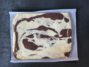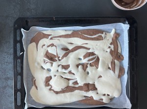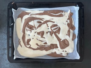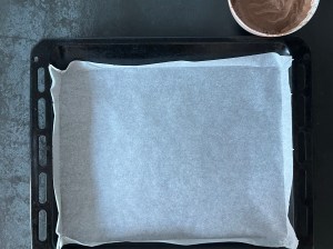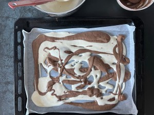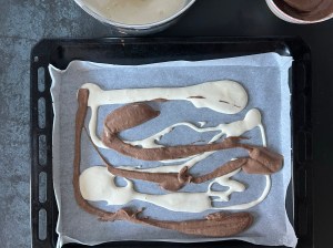 Jag klär en plåt med bakplåtspapper och ringlar sedan smeten lite i taget, över hela, för att skapa mönster. Sist skakar jag den lätt för att jämna ut och försiktig puttar jag ut i små hål och ut i hörnen. Men jag är försiktig så att jag inte blandar för mycket, då den inte blir lika fin då.