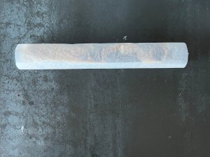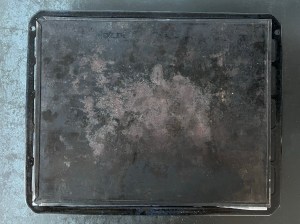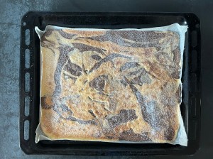 Efter det bakar jag av den. Tar ut den och strör strösocker ovanpå. Lägger ett bakplåtspapper på den sockrade ytan, ovanpå det lägger jag en plåt och sedan vänder jag allt upp och ned. Lyfter bort plåten och drar försiktigt av bakplåtspapperet. Sen låter jag den svalna på ett galler.