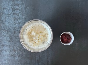 När den svalnar så vispar jag färskostcrémen och väger upp sylten. Crèmen vispar jag genom att ta lika delar färskost och vispgrädde och vispa till en fast crème.