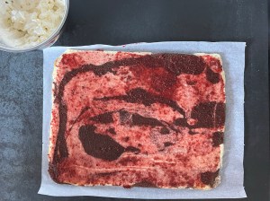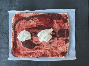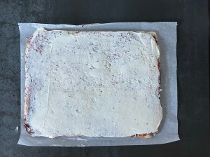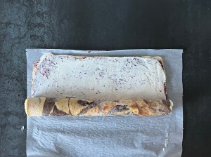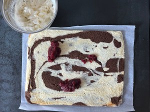 När rulltårtan har svalnat brer jag ett tunt lager hallonsylt över hela botten och sedan breder jag crèmen ovanpå. Rullar sedan samman den och rullar in i bakplåtspapperet innan jag kyler den i minst 15min.