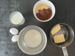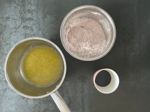 Först gör jag våffelsmeten. Blandar alla torra ingredienser i en skål, smälter smöret och väger upp mjölken i två lika delar, hälften i en bunke och resten i ett glas.