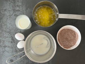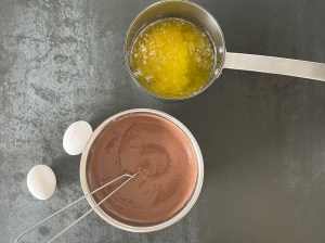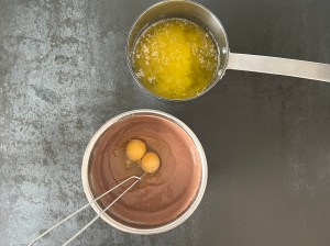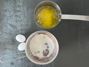 Tillsätter sedan äggen och vispar samman. Sist tillsätter jag det smälta smöret och vispar till en jämn smet.