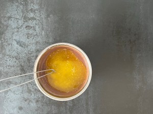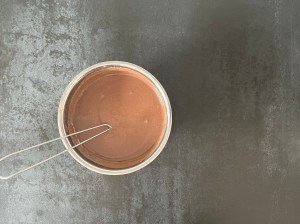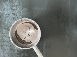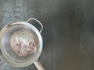 Jag tillsätter kaffet i smöret och sedan siktar jag de torra ingredienserna genom en finmaskig trådsil ned i smöretkaffet och vispar samman till en jämn smet.