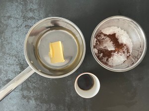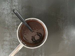 Jag startar våffeljärnet och sätter igång med glasyren. Brygger starkt kaffe, väger upp smör i en kastrull, tipset här är att ta en lite större så att man sedan får plats med allt, framförallt florsockret när man siktar det, har en förmåga att landa utanför om kastrullen är för liten. Väger upp de torra ingredienserna i en skål och blandar dem med gaffel. Sedan smälter jag smöret.