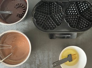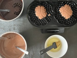 Dags att grädda. Jag penslar det varma järnet med lite rapsolja på alla ytor, sedan lägger jag en stor matsked i mitten på järnet och gräddar. Jag vill inte ha stora våfflor nu, utan små och ”levande”.