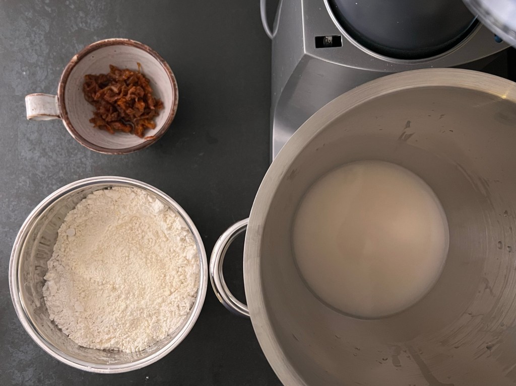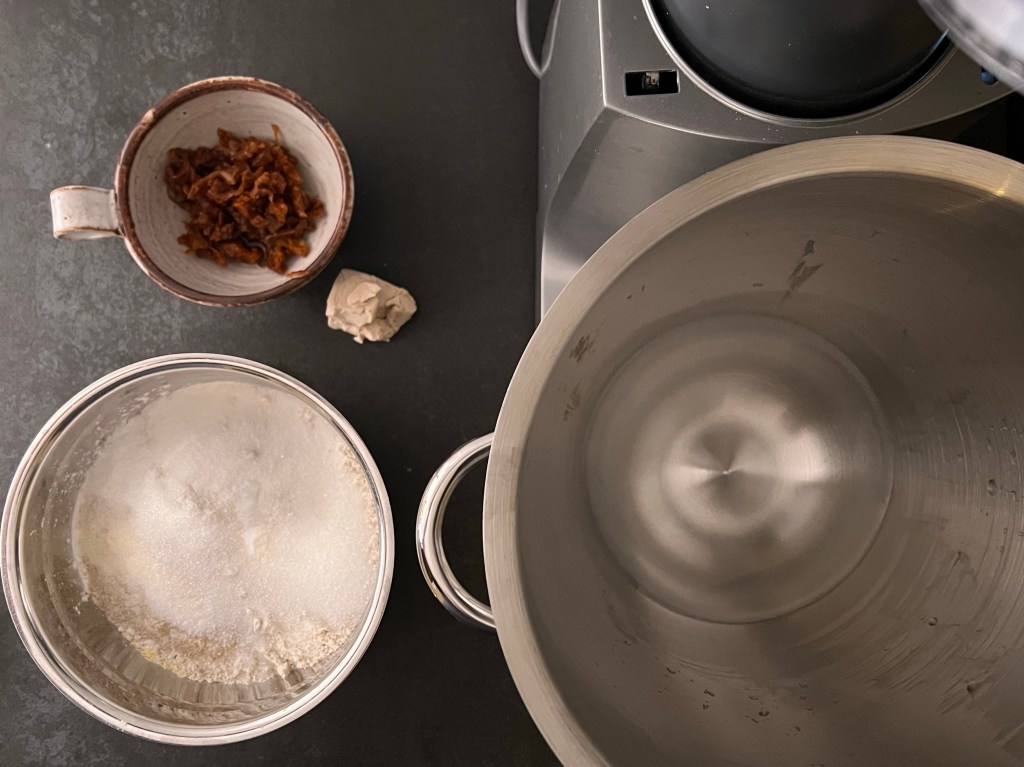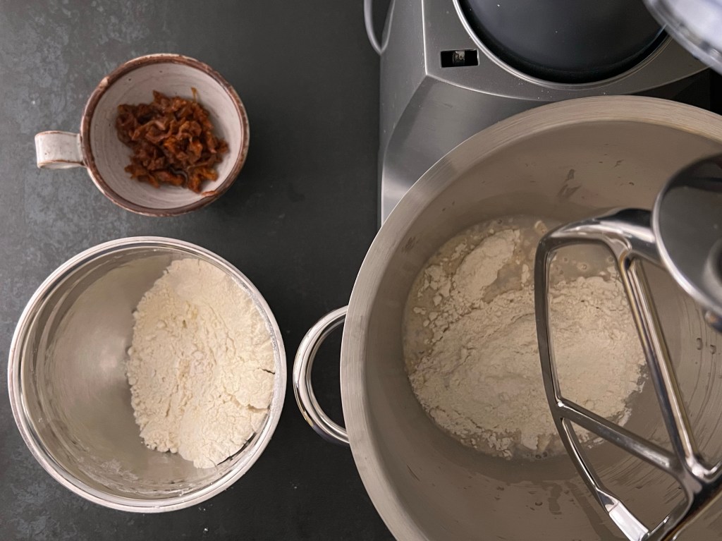 Jag börjar med att väga upp alla torra ingredienser i en skål och blanda till en mjölmix. Sen kramar jag ur oljan ut tomaterna och fintärnar dem. Väger upp oljan på tomaterna, samt jäst och vatten och löser sedan upp jästen i vattnet.