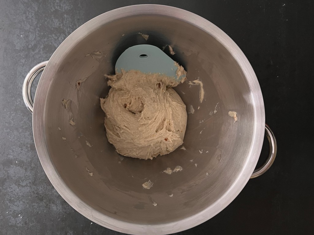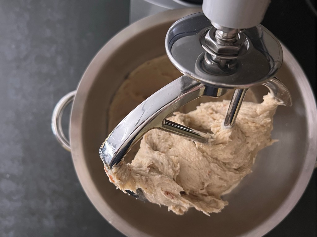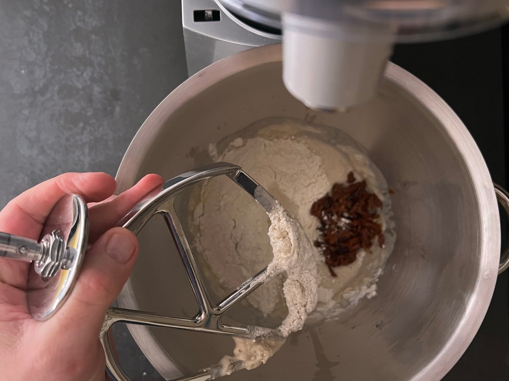 4. Tillsätt resten av mjölmixen samt de soltorkade tomaterna och oljan. Blanda strax över medelfart (4 av 6 på min Kenwood) i ca 5min