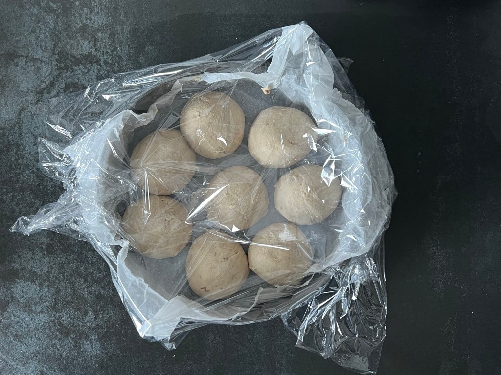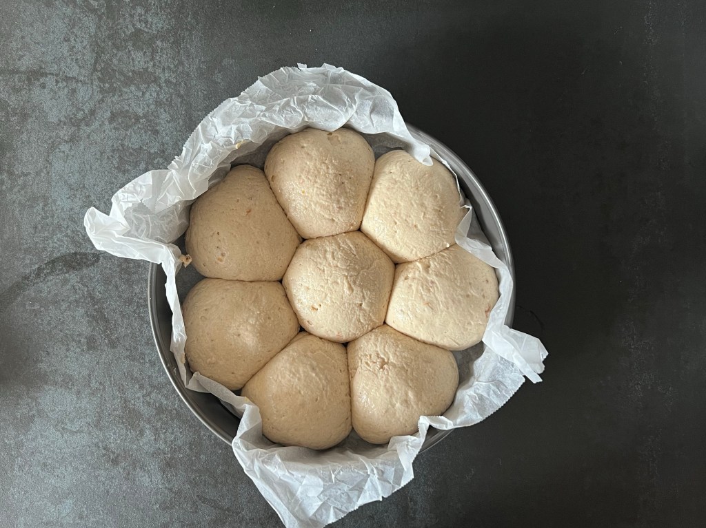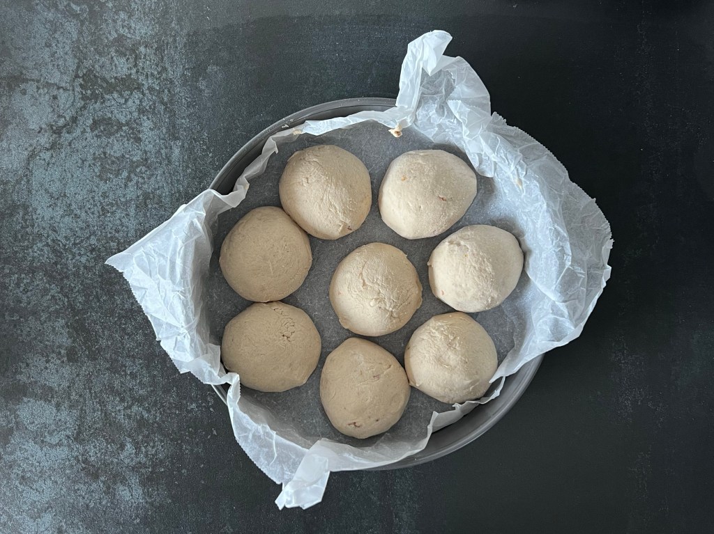 Tar upp degen på mjölad bänk, klär en springform med bakplåtspapper och väger sedan upp degen i 8st lika stora bitar, ca 110g styck. Rullar degbitarna till jämna bollar och lägger i formen. Plastar och låter jäsa i ca 45min.