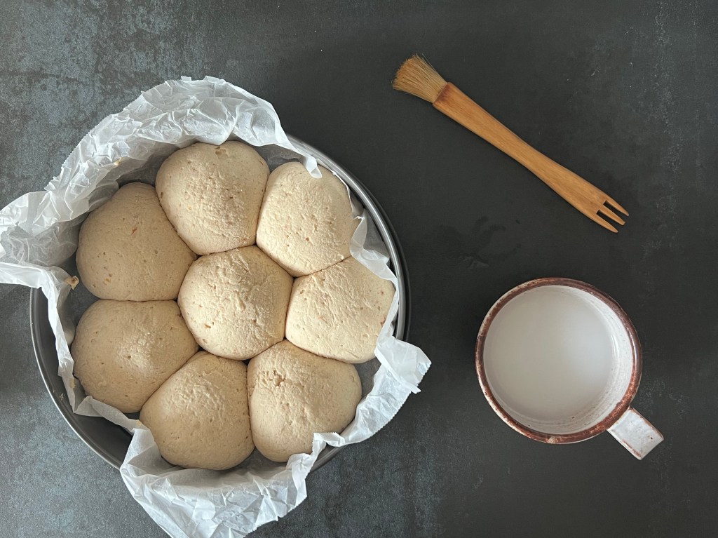 12. När degen jäst klart, blanda vatten och potatismjöl som du sedan penslar brödet med