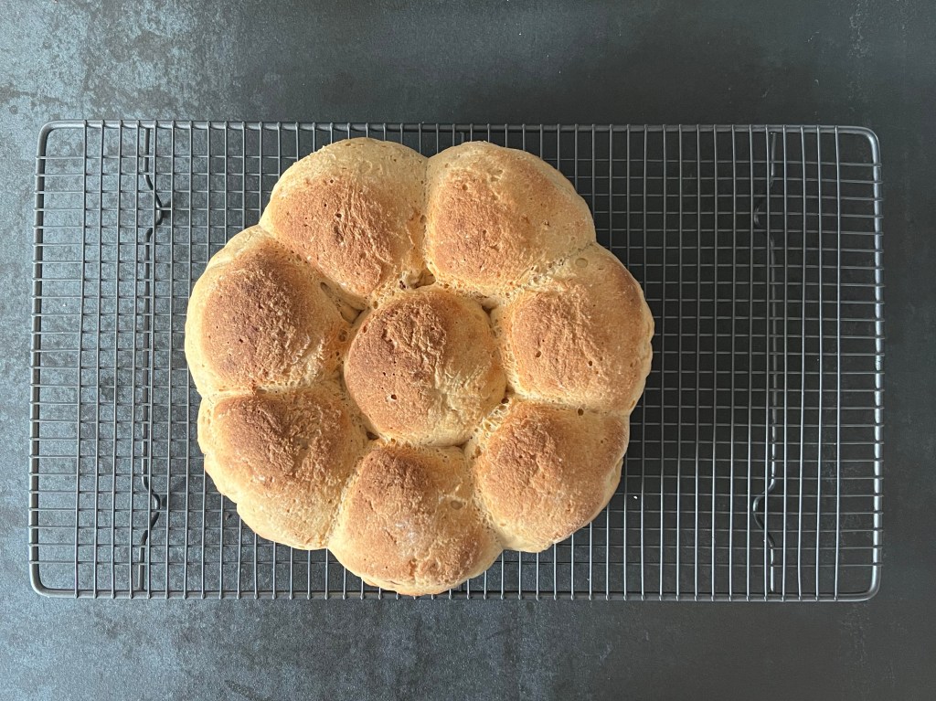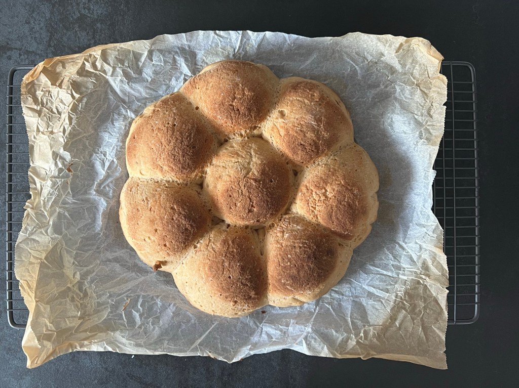 När brödet jäst färdigt så blandar jag vatten och potatismjöl och penslar det med. Man kan pensla med ägg också om man vill. Bakar sedan av det i ca 18min. Låter det sedan vila i formen i ca 3-5min innan det får svalan på ett galler, utan form och bakplåtspapper.
