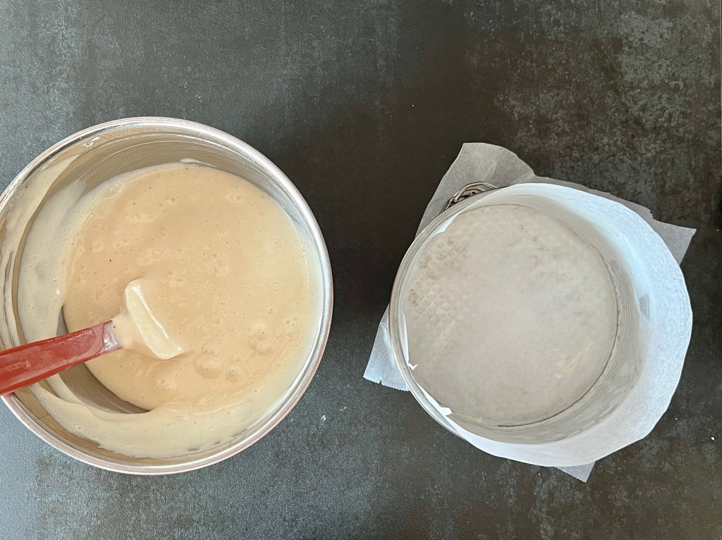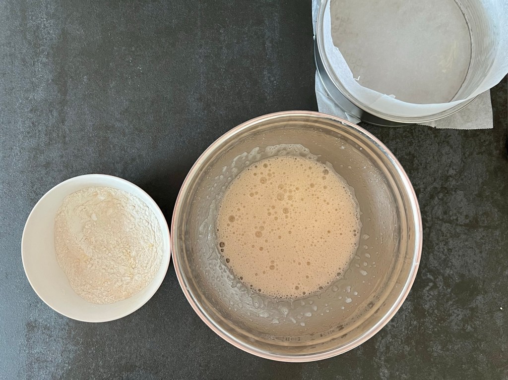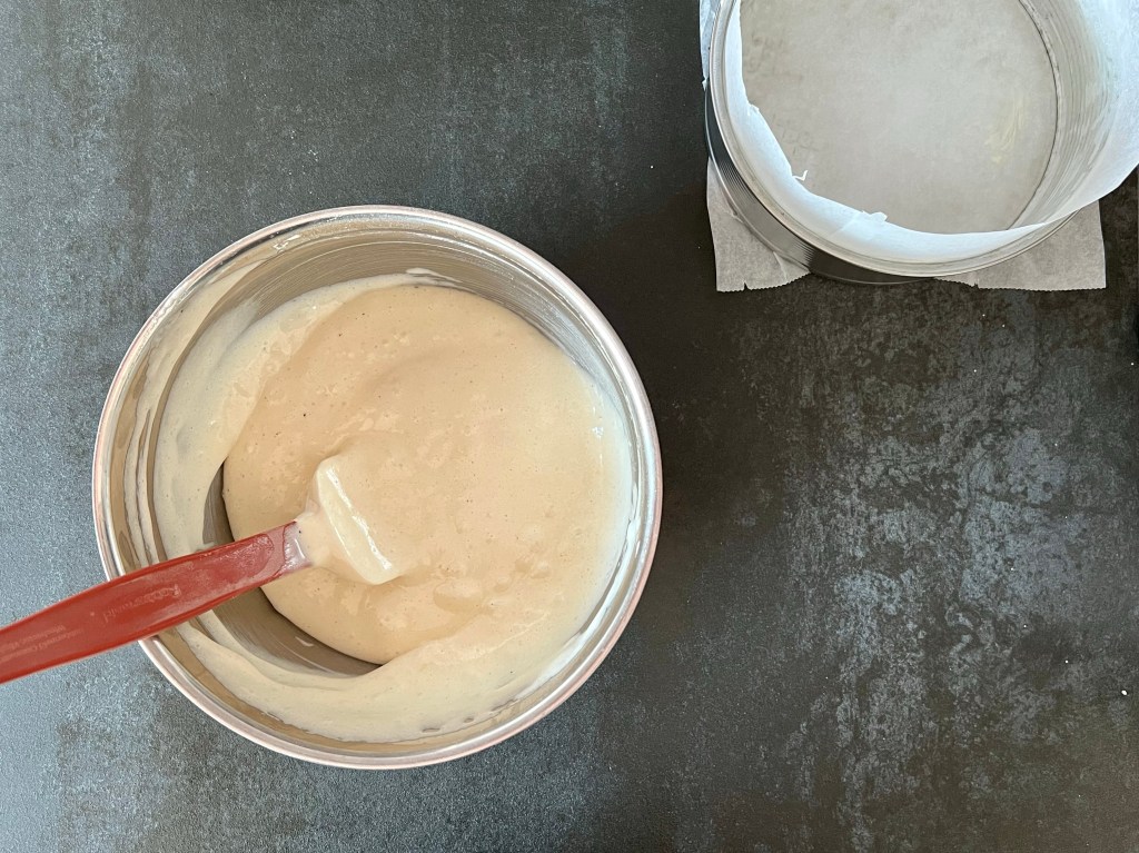 Jag börjar med att väga upp alla ingredienser och sedan blanda alla torra förutom socker till en mjölmix. Sen klär jag springformen med bakplåtspapper. Både i botten och runt om. Värmer därefter ägg och socker över vattenbad, vispar för hand och värmer tills det är 37°c. Tar av äggmixen från vattenbadet och vispar, med elvisp till en vit och riktigt pösig konsistens. Tillsätter sedan mjölmixen och vänder ned den med en slickepott, tills det är en jämn smet. Gäller över smeten i springformen och bakar av.