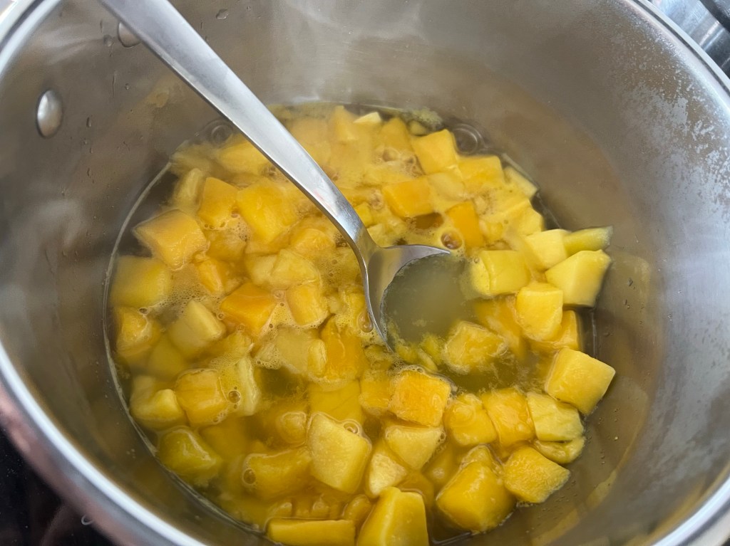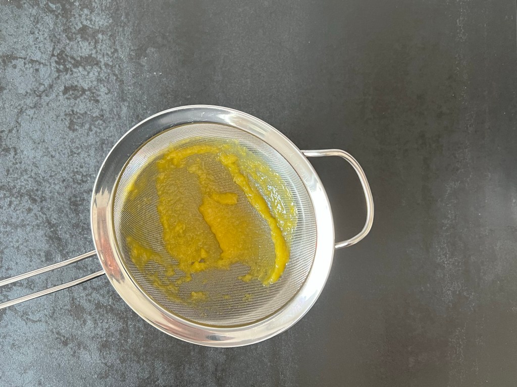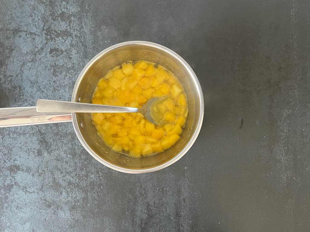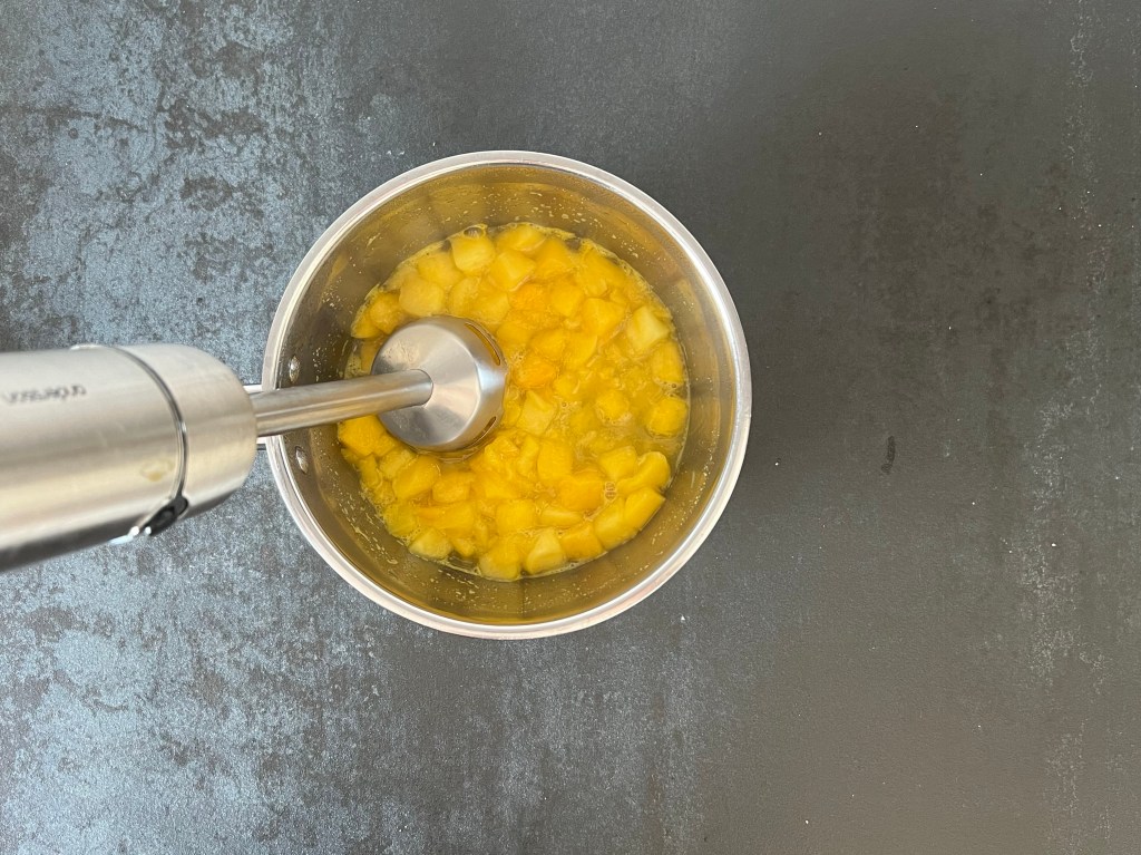 Jag börjar med mangocurden. Värmer upp mango i lite vatten, mixar till en slät puré, passerar genom en finmaskig trådsil och gör sedan curden, på den purén.