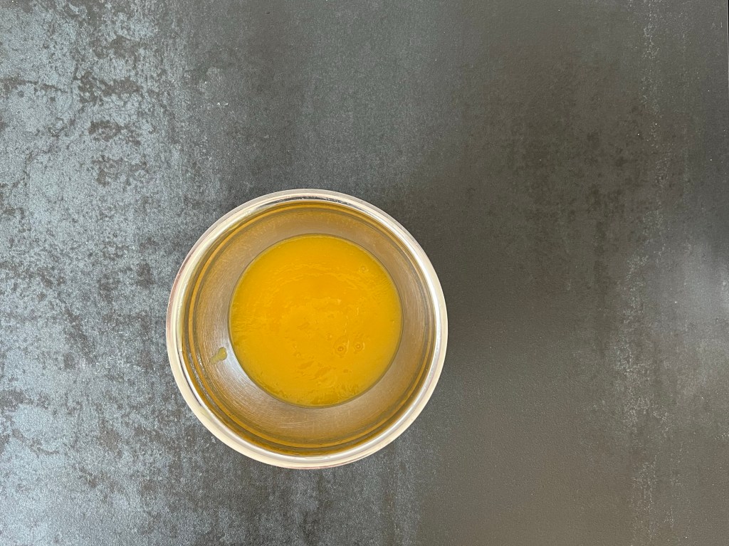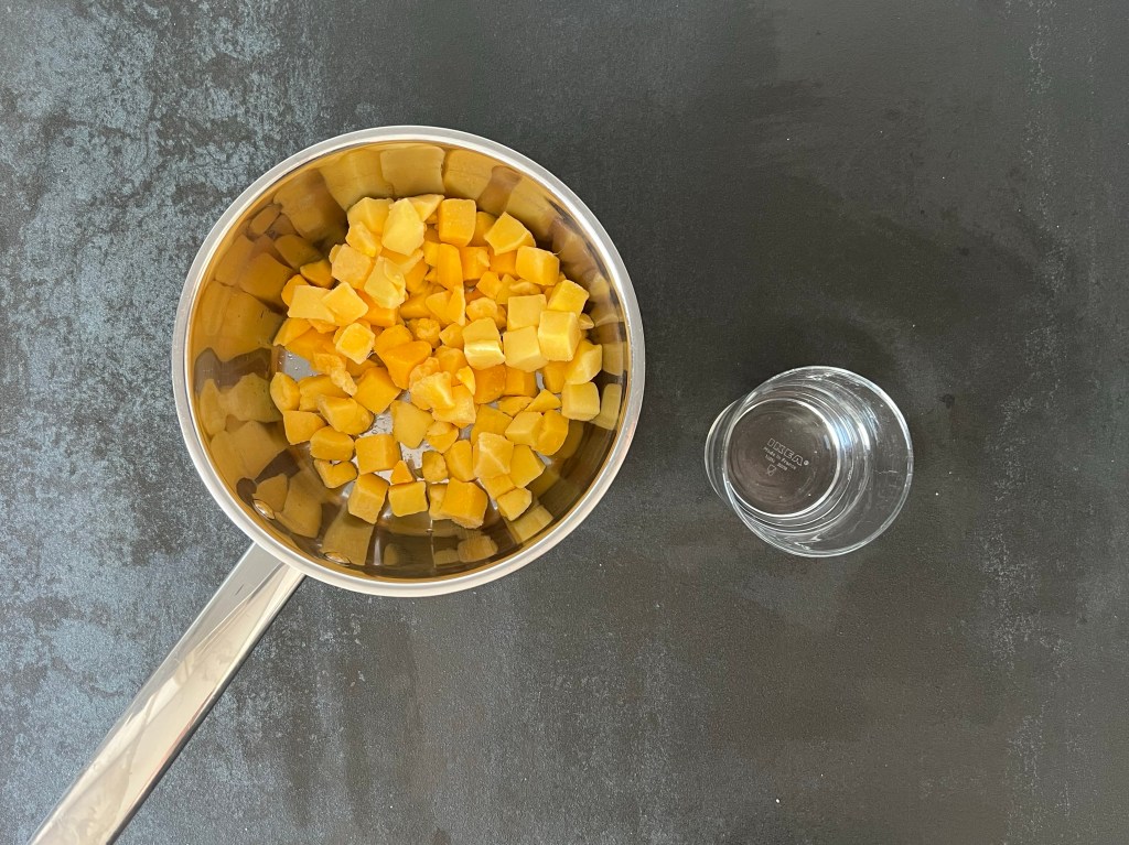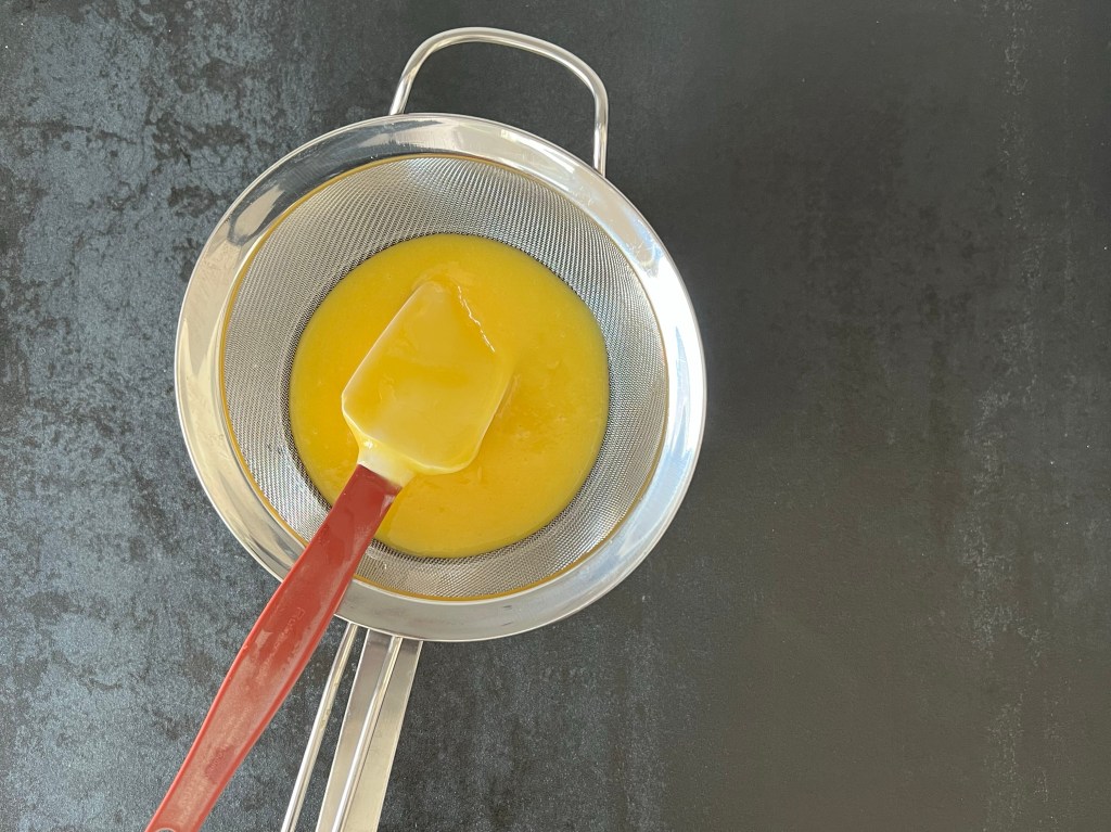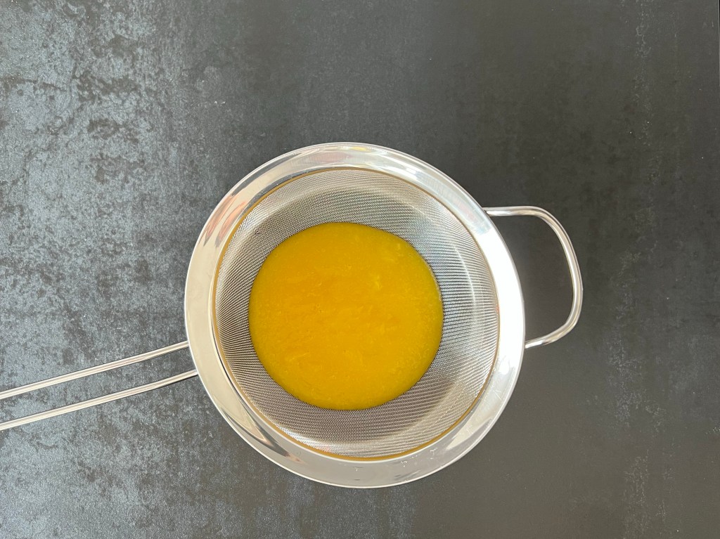 Jag börjar med mangocurden. Värmer upp mango i lite vatten, mixar till en slät puré, passerar genom en finmaskig trådsil och gör sedan curden, på den purén.