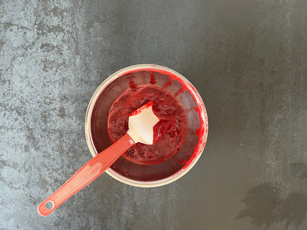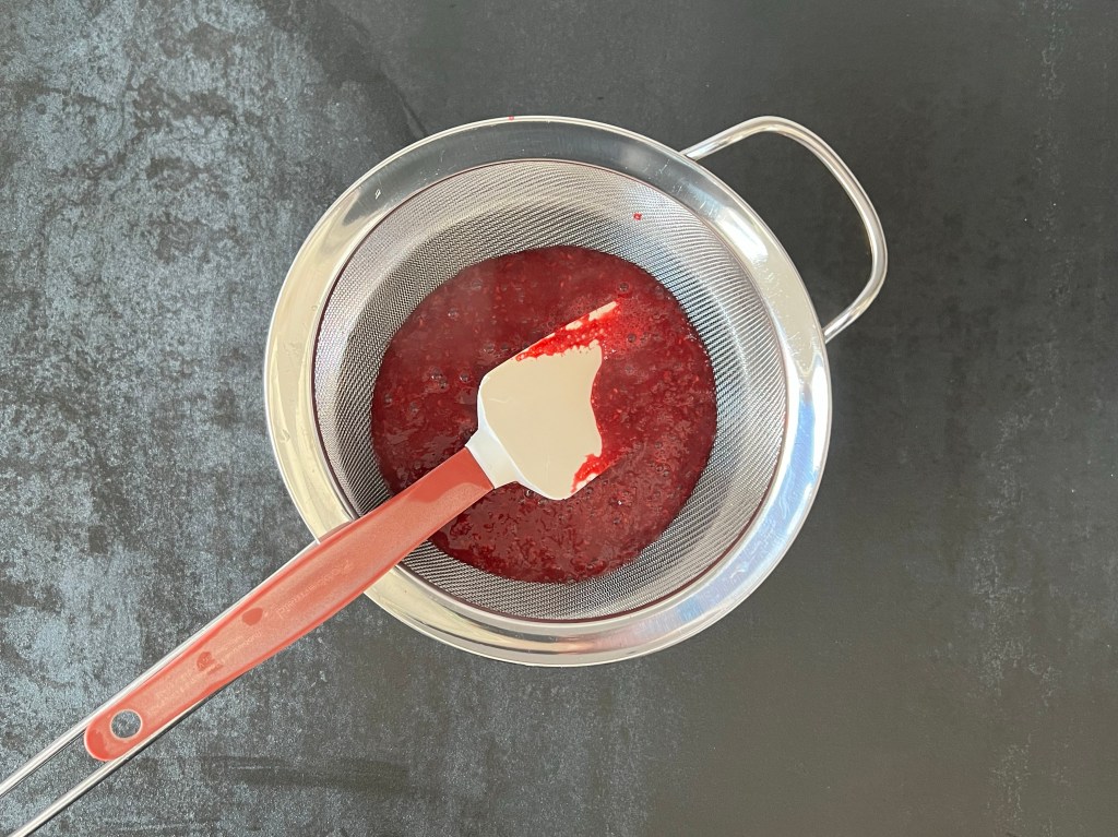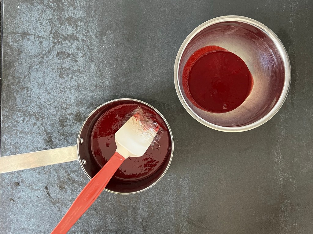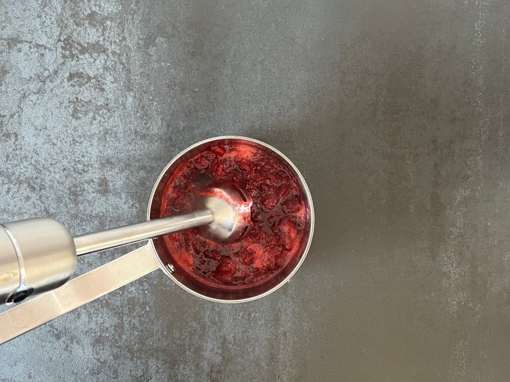 Medan botten svalnat så gör jag min hallonmousse. Så gott och så enkelt. Jag värmer hallon i vattnet, kokar samman, mixar slätt och passerar genom finmaskig trådsil. Arbeta lite extra här så att ni får med er allt. Blötlägger gelatinet innan jag börjar vispa i nästa steg.