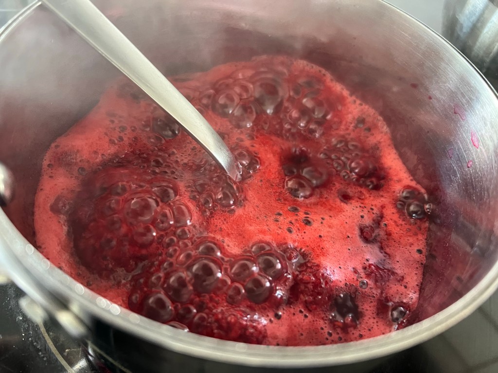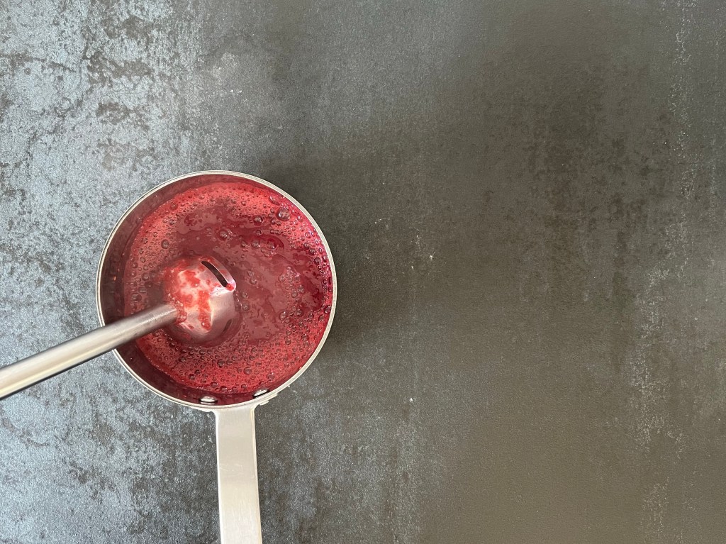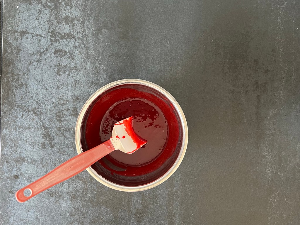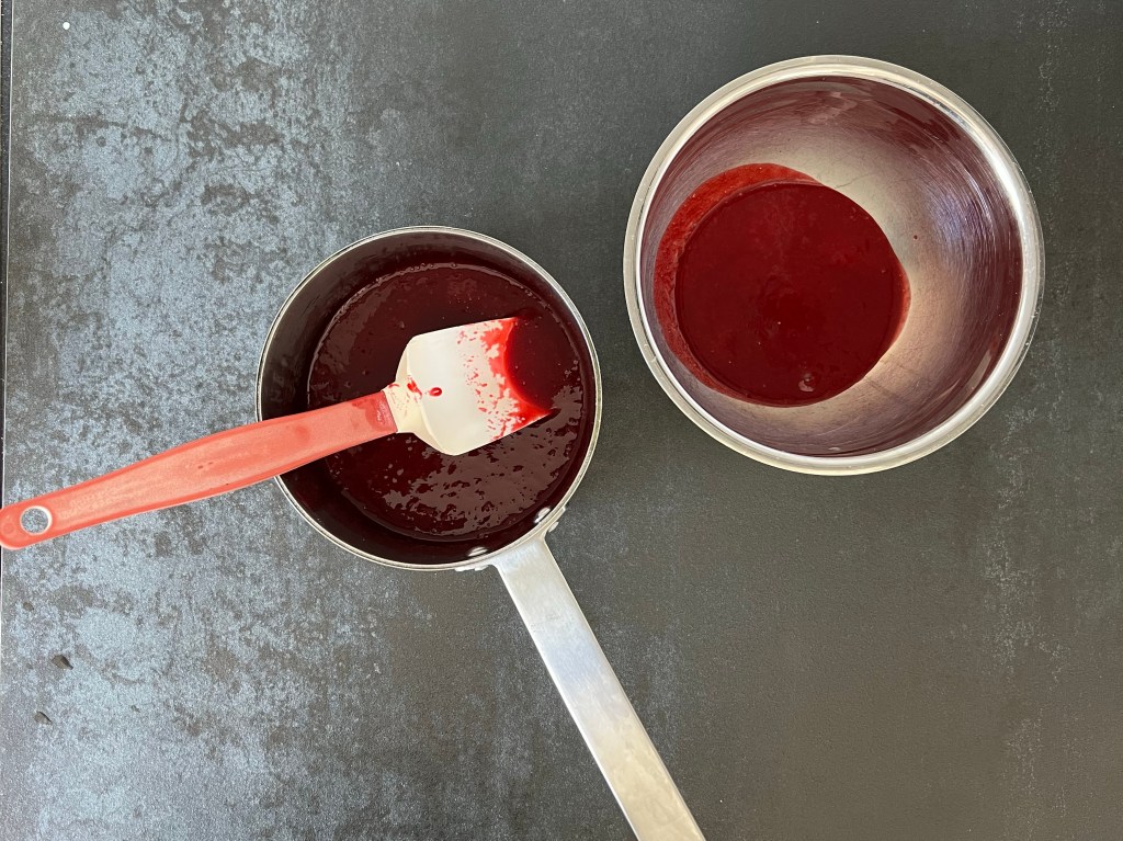 Medan botten svalnat så gör jag min hallonmousse. Så gott och så enkelt. Jag värmer hallon i vattnet, kokar samman, mixar slätt och passerar genom finmaskig trådsil. Arbeta lite extra här så att ni får med er allt. Blötlägger gelatinet innan jag börjar vispa i nästa steg.