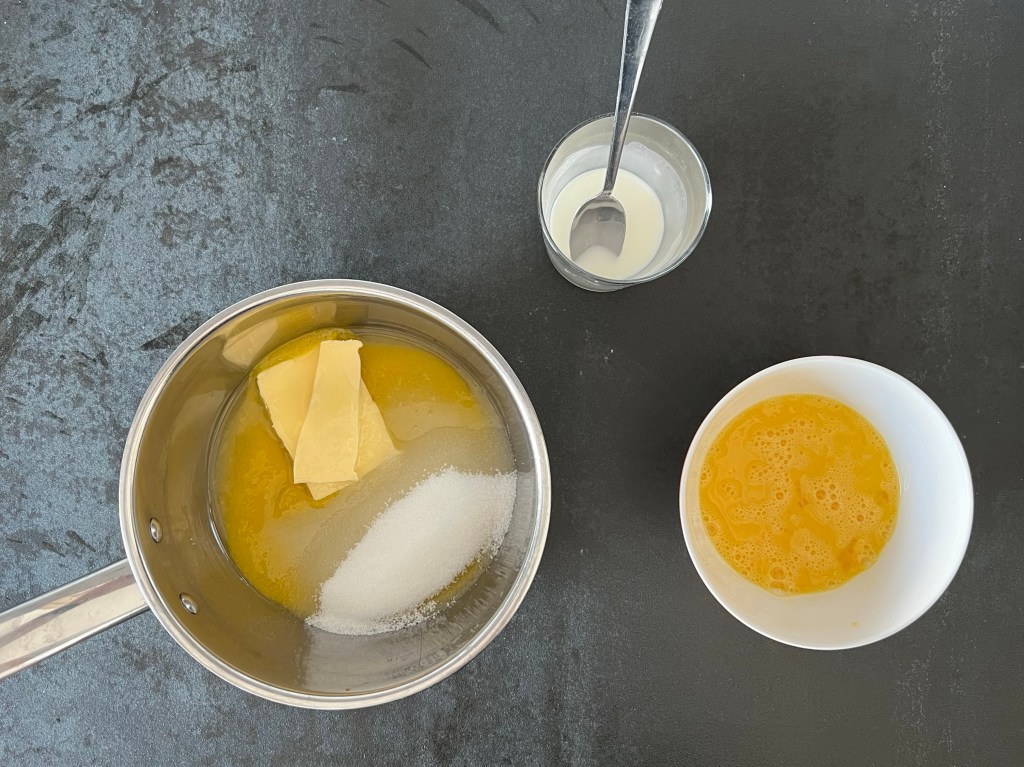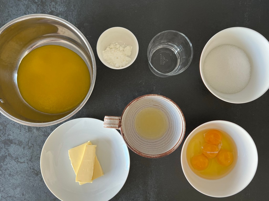 Väger upp puré, pressar citron, och väger upp allt annat. Blandar puré, socker, smör och citronsaft i en kastrull. Blandar majsstärkelsen med vattnet och vispar samman äggen. Sen kokar jag upp allt som är i kastrullen och tar den sedan åt sidan.